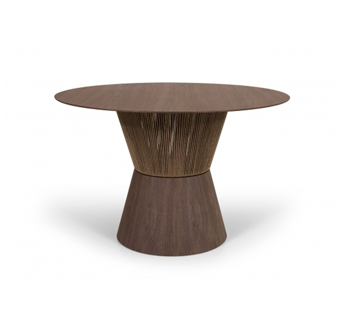 Mesa de comedor con base en madera color nogal, tejida con cuerdas naturales y tapa redonda tambien en madera.